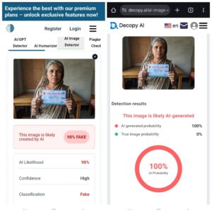 এদিকে বেলা বাড়ার সাথে সাথে সেই “ভোটার সম্মানি রশিদ” হাতে এক বয়ষ্ক নারীর ছবি সামাজিক যোগাযোগের মাধ্যমে ছড়াতে থাকে৷ দৈনিক এখনই সময় এর হাতে আসা সেই ছবিটিকে এআই চেকারের মাধ্যমে যাচাই করা হলে একটি সাইট সেই ছবিটিকে ৯৮% ফেইক বা এআই জেনারেটেড হিসেবে চিহ্নিত করে৷ এই প্রতিবেদন আরও নিশ্চিত হতে আরেকটি সাইটে সেই একই ছবিটি ক্রস চেকে দিলে ফলাফল আসে ১০০% নকল ছবি অর্থাৎ সম্পূর্ণ ছবিটি এআই প্রযুক্তি ব্যবহার করে বানানো৷